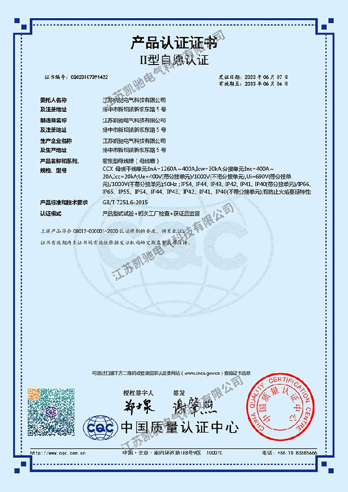 CCX母线槽1260A认证证书